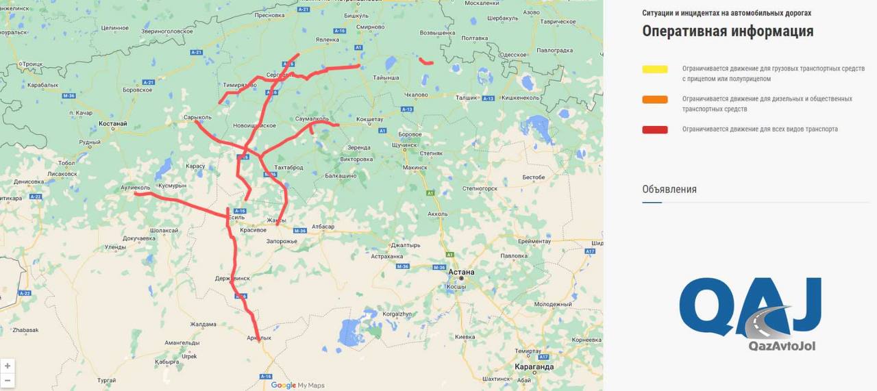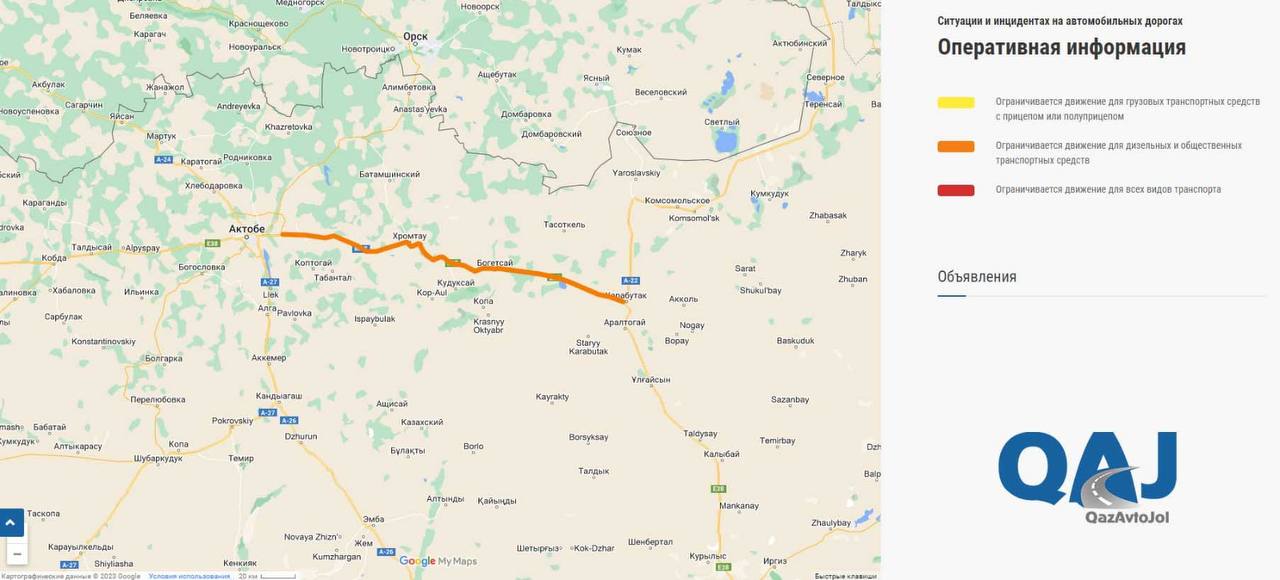 Так, например, в Актюбинской области ограничено движение для дизельных и общественных транспортных средств на участке дороги от Актобе до села Карабутак.