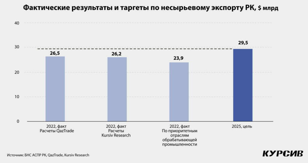 экспорта несырьевых товаров» перешел в национальный проект «Устойчивый экономический рост, направленный на повышение благосостояния казахстанцев», рассчитанный на 2021–2025 годы. Планка, которую необходимо взять к 2025-му, – достижение уровня в $29,5 млрд вывезенных за рубеж несырьевых товаров.