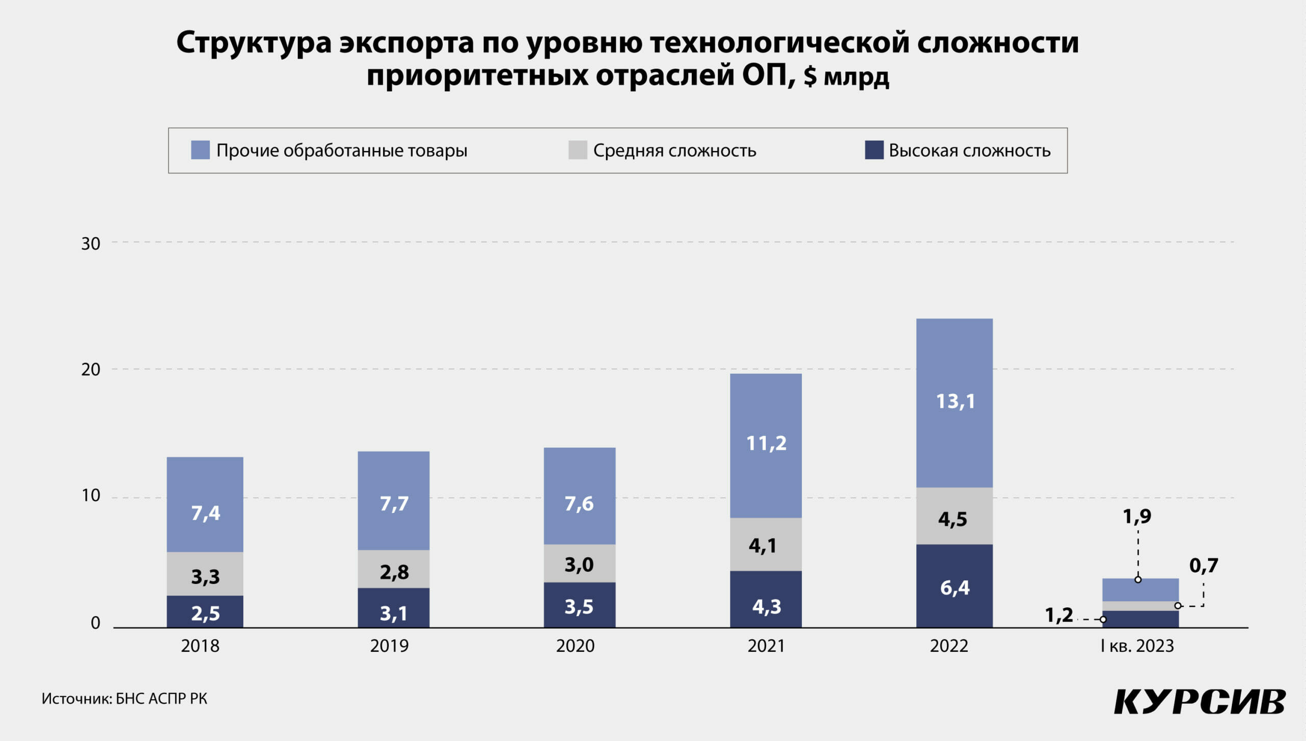 Расчеты неправительственных исследовательских организаций демонстрируют похожую картину. По расчетам Kursiv Research, несырьевой экспорт Казахстана в 2022 году достиг $26,2 млрд. Для нашей страны это рекордный показатель за последние десять лет. Даже в период относительно дорогого тенге несырьевой экспорт в денежном выражении был меньше. Например, в один из пиковых для себя периодов, в 2012 году, он составлял $21,3 млрд.
