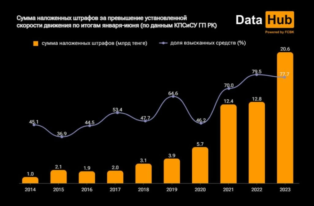 На сколько увеличилась сумма штрафов. Общая сумма штрафов за год увеличилась на 61% – с 12,8 млрд тенге до 20,6 млрд тенге при росте среднего размера штрафа на 15%, до 13 тыс. тенге.