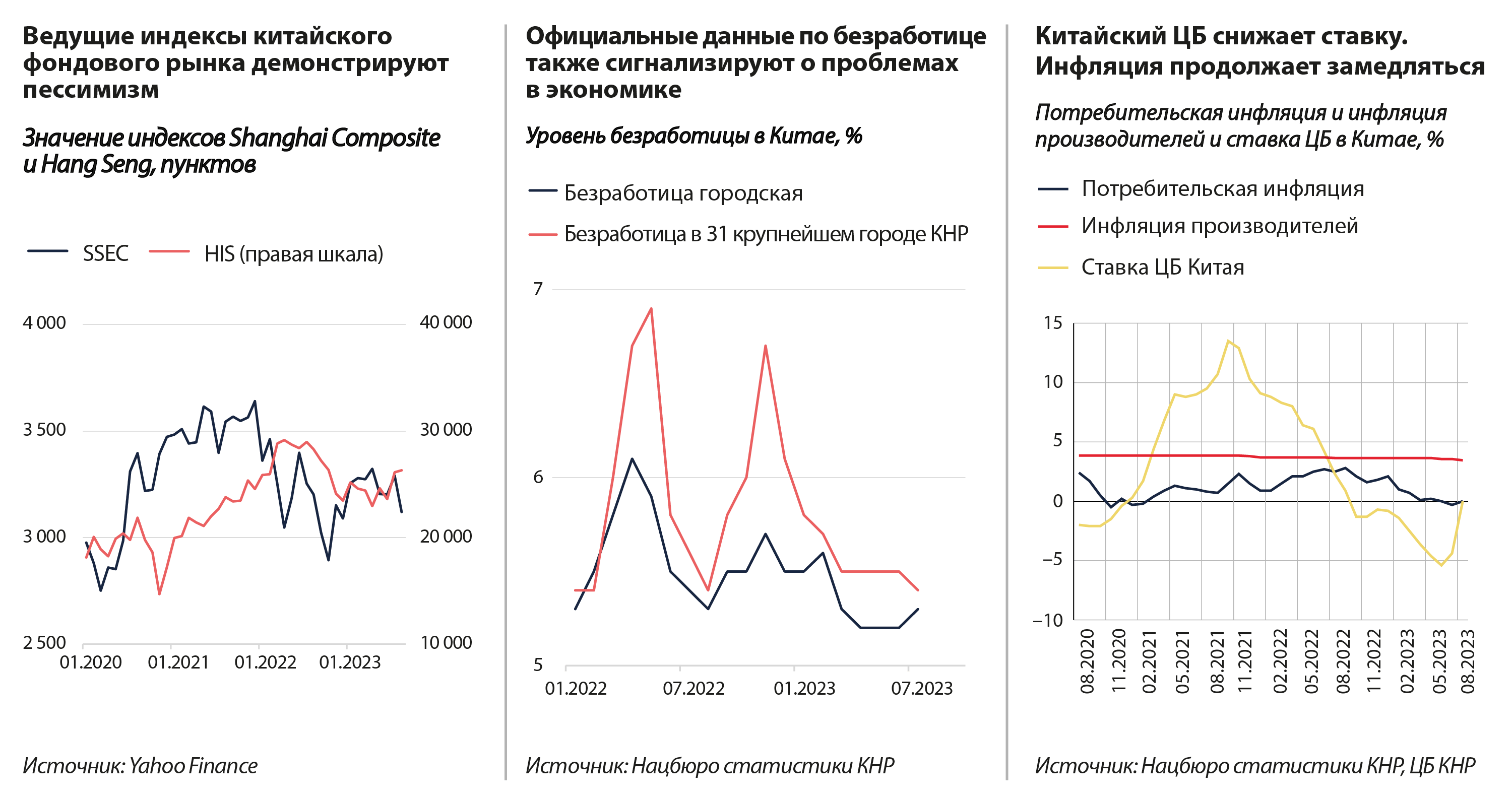 Уровень безработицы – в КНР публикуют лишь данные по городской безработице – практически не меняется (в последние полтора года находится в диапазоне 5,2–6,1%), однако молодежная безработица (рабочая сила в возрасте от 16 до 24 лет) в первые полгода 2023-го ускорилась с 16,7 до 21,3%, а по итогам июля показатель так и не был опубликован.