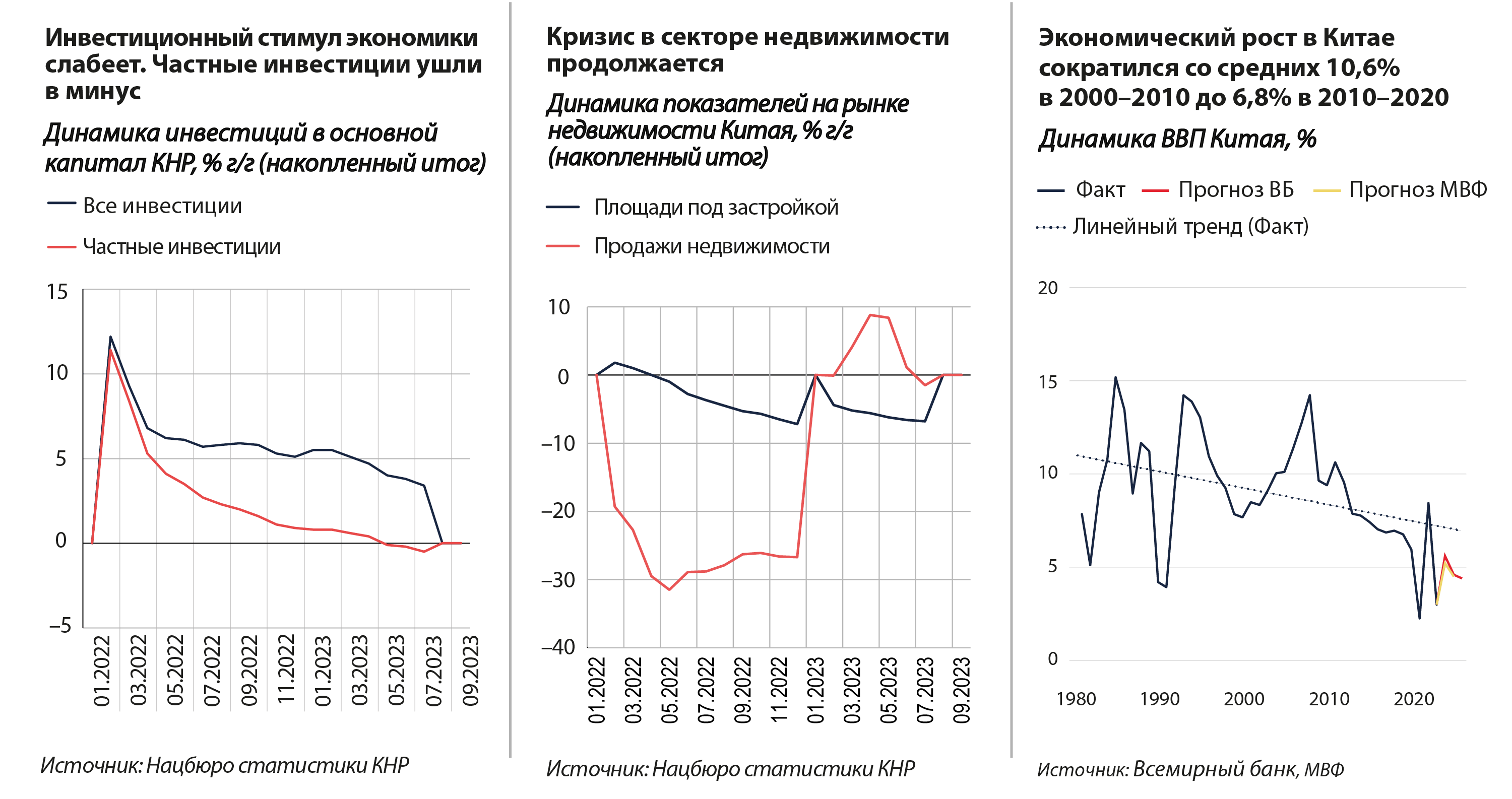 Наиболее жесткий сценарий для Китая от Moody’s предполагает торможение до среднего роста в 3,5% в год на отрезке 2023–2030 годов. Аналитики Euromonitor считают, что долгосрочный рост ВВП Китая будет ниже траектории 7–8% в год и оценивают влияние китайского замедления на глобальный экономический рост в 0,1–0,5 п. п. в 2023–2024 годы.