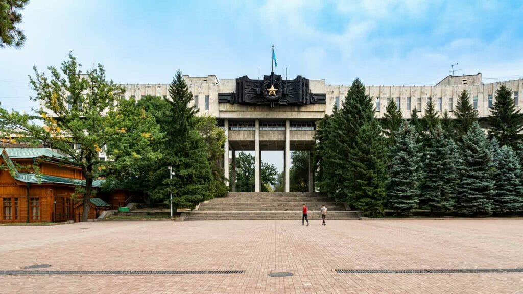 О Доме армии (бывшее название – Дом офицеров). Здание построили в 1978 году по проекту архитекторов Юрия Ратушного, Олега Балыкбаева, Тохтара Ералиева. Дом расположен перед восточным входом в парк имени 28 гвардейцев-панфиловцев. Площадь сооружения составляет 11 тыс. 609 кв. м.