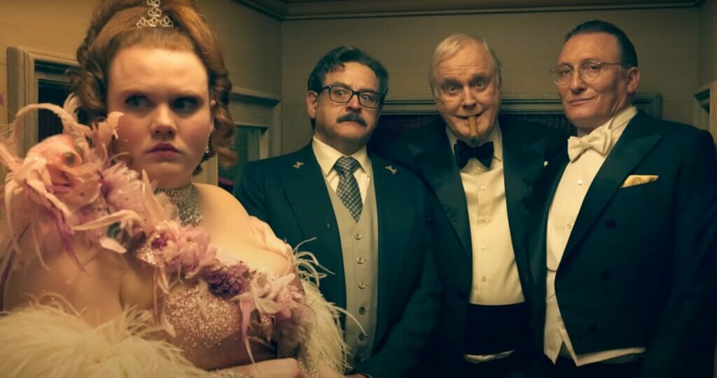Итак, действие нового фильма Романа Полански происходит накануне Миллениума, 31 декабря 1999 года, где-то в швейцарских Альпах. В ультрафешенебельную гостиницу под названием Palace один за другим прибывают гости, все очень богатые и почти все с придурью, карикатурные миллионеры и миллионерши. Тут и загорелые финансисты в идиотских париках (Микки Рурк напоминает Трампа), и пожилые французские аристократки с собачками (Фанни Ардан), и популярные в прошлом порноактеры (Лука Барбарески), и дряхлые папики с юными любовницами (популярный комик Джон Клиз с малоизвестной Бронвин Джеймс). Найдется место в этом люксовом балагане и богатым восточным женщинам в никабах, и успешному пластическому хирургу (португальский актер Жоакин де Алмейда), и гоп-компании русских бандитов (Александр Петров и Антон Пампушный). Чемоданы последних, как это подсказывают клише, набиты нелегальными долларами, а номера веселыми проститутками. В общем, кого здесь только нет.