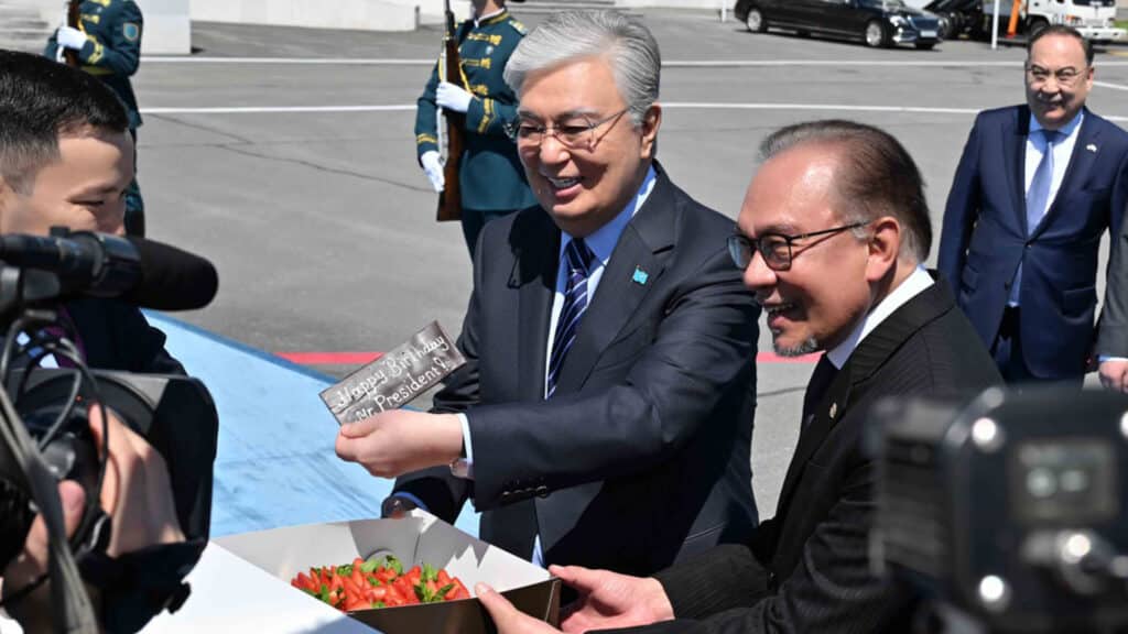Шоколадный торт с клубникой подарил президенту РК Касым-Жомарту Токаеву премьер-министр Малайзии Анвар Ибрагим. Подарок сопровождала надпись: Happy birthday mr. President. Токаеву сегодня исполнился 71 год.