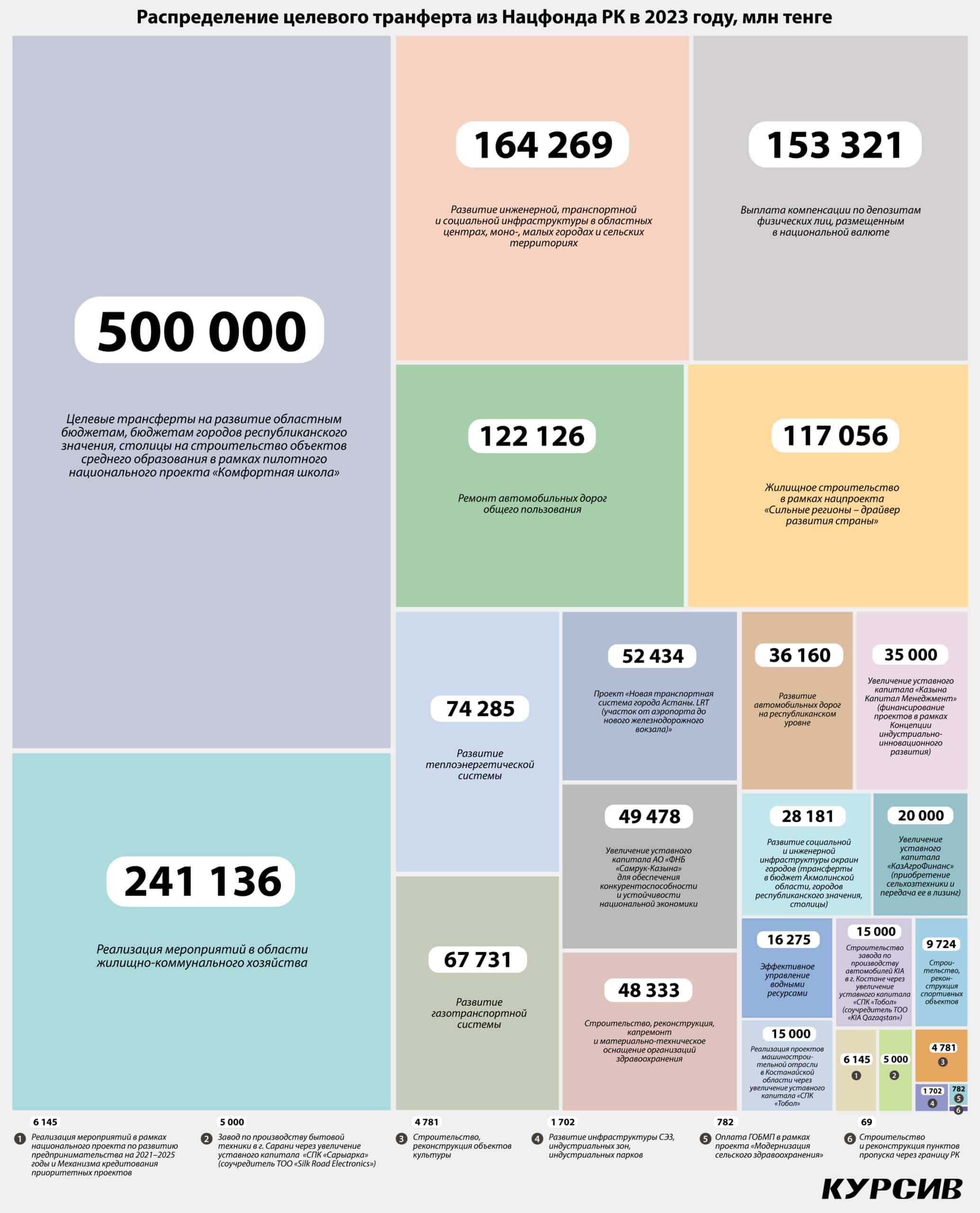 «Курсив» составил инфографику, чтобы показать, на что именно было направлено 1,8 трлн тенге из Нацфонда РК в 2023 году. Почти 500 млрд тенге пошло на строительство объектов среднего образования в рамках пилотного нацпроекта «Комфортная школа». 241 млрд тенге – на развитие системы водоснабжения и водоотведения в городах и селах, развитие систем теплоснабжения. 122 млрд тенге направлено на ремонт дорог общего пользования и еще 36 млрд – на развитие автомобильных дорог на республиканском уровне. Более 52 млрд тенге из Нацфонда пошло на увеличение уставного капитала юридических лиц на строительство в рамках проекта «Новая транспортная система города Астаны. LRT (участок от аэропорта до нового железнодорожного вокзала)». Поддержку из средств НФ РК получили также завод по производству автомобилей KIA в Костанае и завод по производству бытовой техники в Сарани – здесь изготавливают продукцию под узбекским брендом Artel.