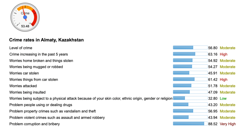 Алматы занимает 95-ю строчку из 311 с индексом преступности 53,7 и индексом безопасности 46,3. На высоком уровне остается беспокойство по поводу возможных актов вандализма, краж авто и взяточничества. При этом бояться, что на вас нападут по расовым, религиозным или гендерным мотивам в Алматы не стоит.