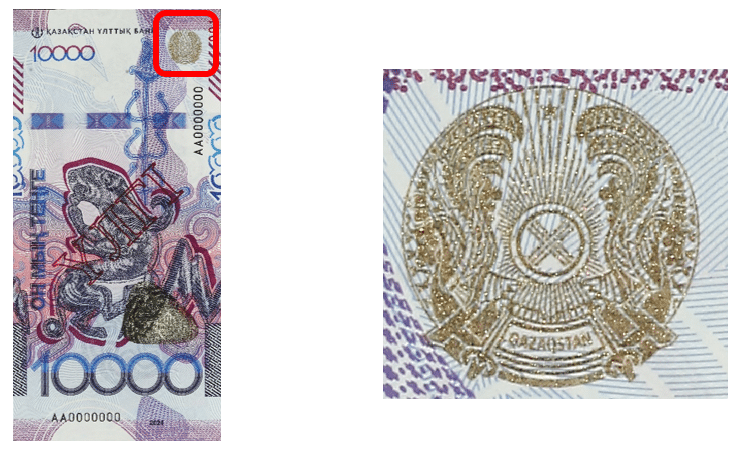 - золотое интаглио – специальный вид печати, создающий рельеф на поверхности банкноты. Герб Казахстана выполнен с использованием специальной золотистой краски;