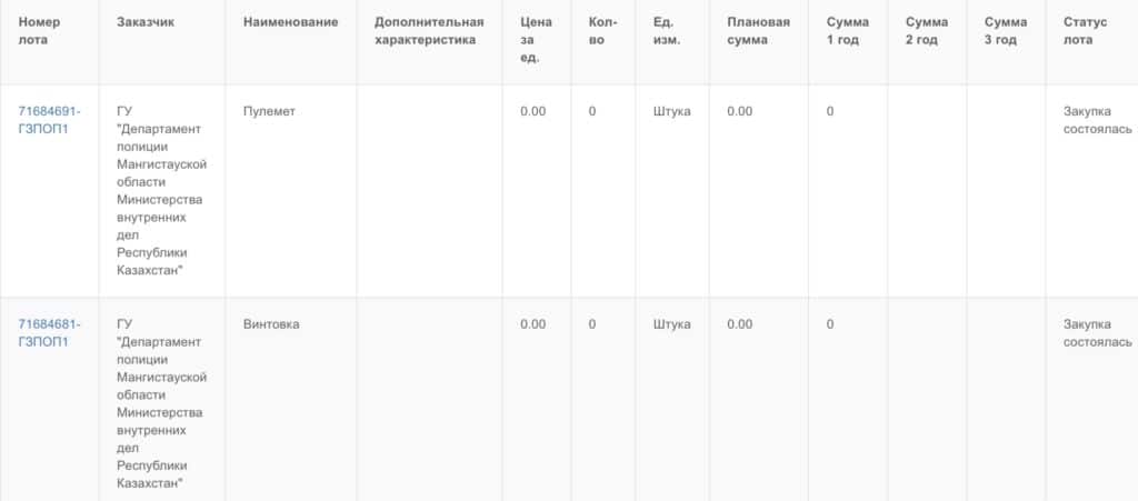Примечательно, что департаменты полиции Астаны, Алматы, Шымкента и Туркестанской области закупали разное оружие, однако пулемет и винтовку себе не приобретали.