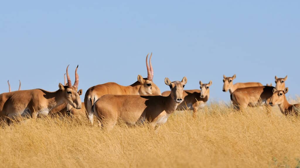 Редкие кадры были запечатлены в Западно-Казахстанской области — одном из немногих оставшихся убежищ этих исчезающих животных. Захватывающее зрелище поражает масштабом: стадо движется синхронно, словно единый живой организм, сливаясь с ландшафтом.