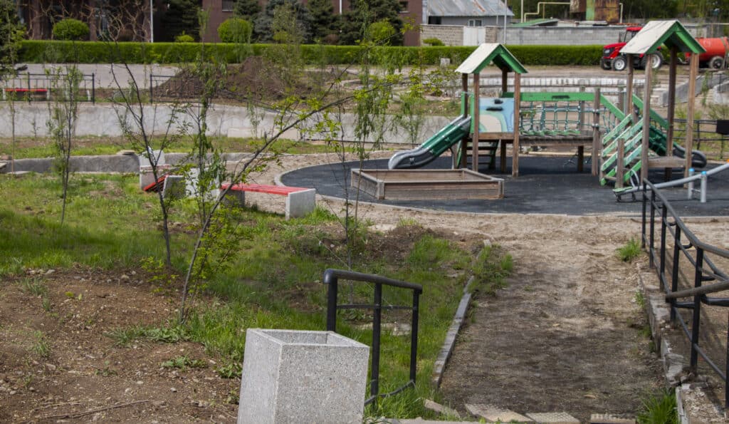Через дорогу от озера проводится реконструкция общественного пространства с детской площадкой ― рабочие перекладывают брусчатку.