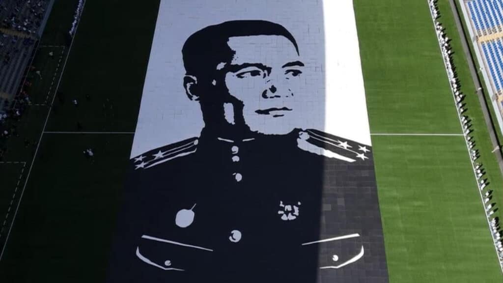 На площади 2 736 квадратных метров раскинулся портрет размером 32 на 70 метров — каждый фрагмент в нем нарисован руками юных художников. Вместе их работы сложились в масштабное и трогательное изображение национального героя.