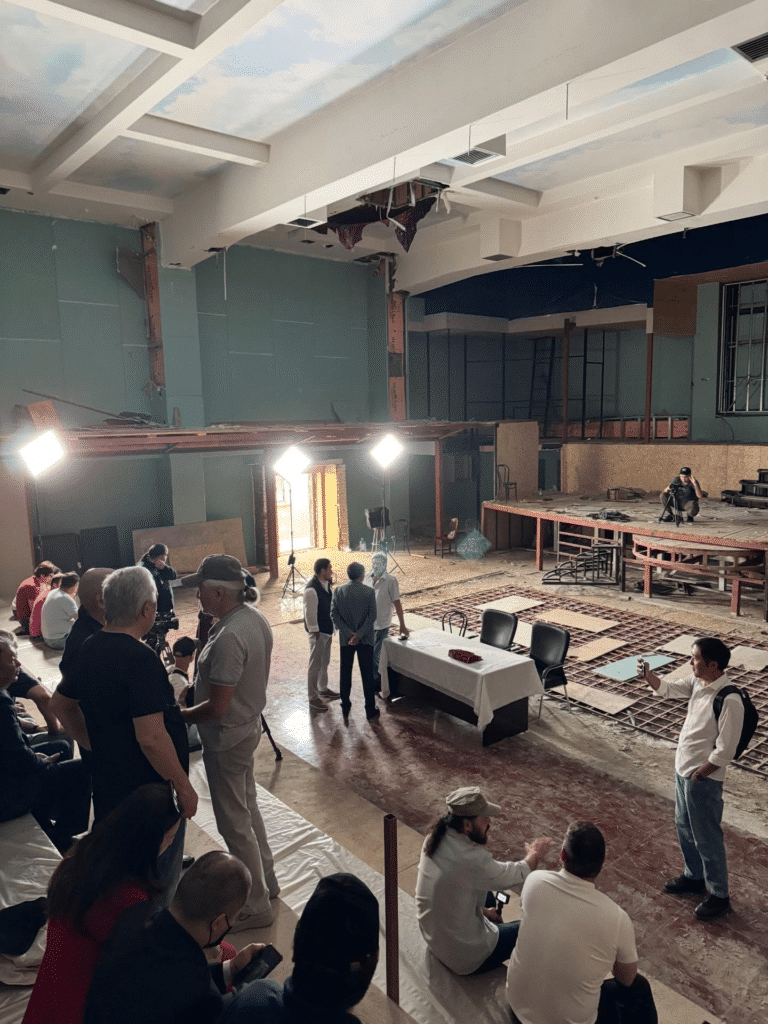 Композитор разместил фото в соцсети Threads. На нем в здании происходит собрание нескольких людей, вероятно, о судьбе «Дома кино». Прежде всего на снимке бросается в глаза печальное состояние здания: обшарпанные стены, толстый слой пыли на полу и обвалившиеся с потолка части.