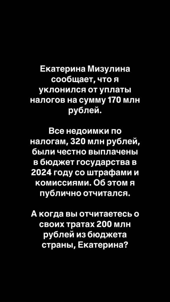 «Все недоимки по налогам, 320 млн рублей, были честно выплачены <…> А когда вы отчитаетесь о своих тратах 200 млн рублей из бюджета страны, Екатерина?»