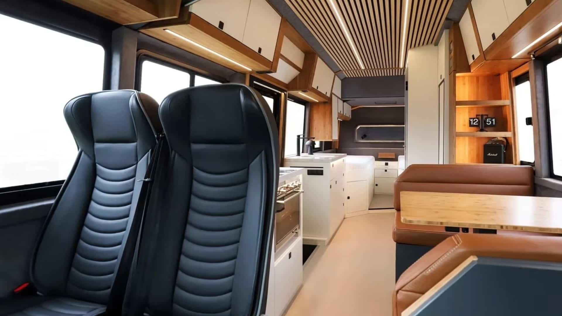 Автодом спроектирован для обеспечения максимального комфорта четырем пассажирам. Внутри салона установили эргономичные сиденья, а в задней части предусмотрели четыре спальных места.