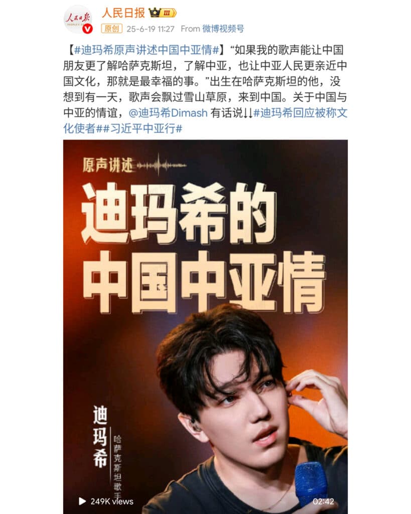 Народный артист Казахстана Димаш Кудайберген дал интервью одной из самых авторитетных китайских газет «Жэньминь жибао» . В коротком видеоинтервью певец поделился мыслями о дружбе между Центральной Азией и Китаем и силе музыки.
