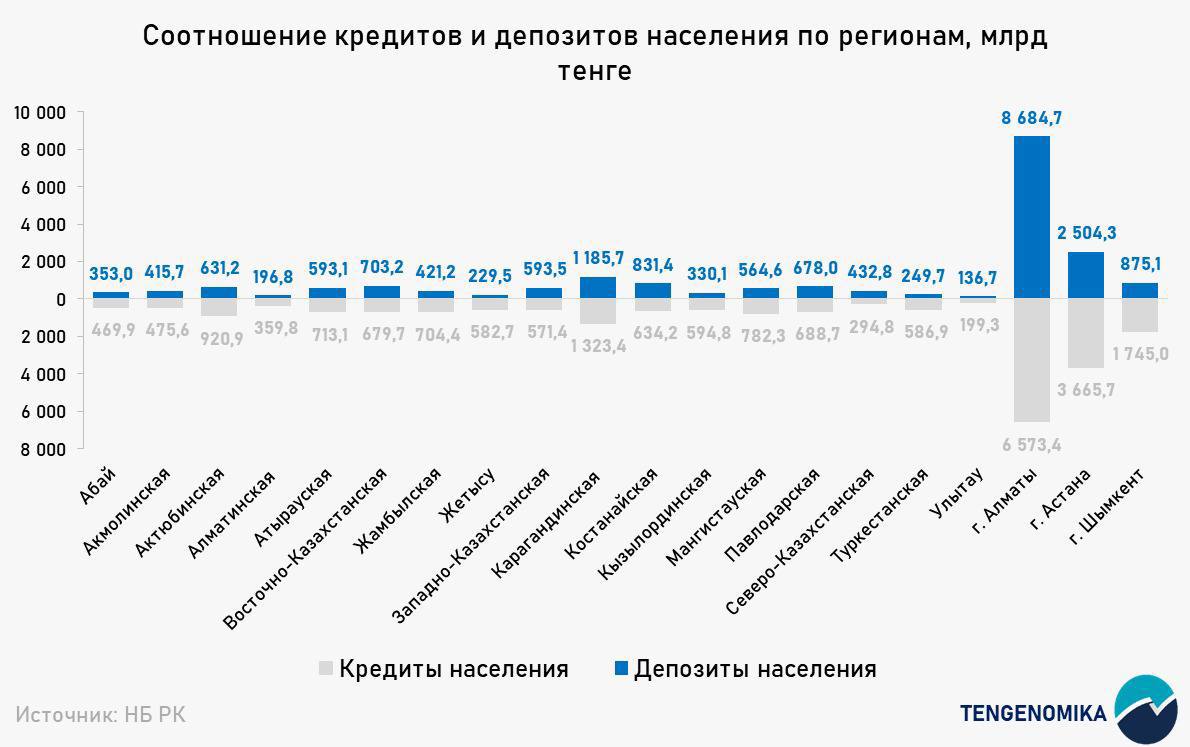 В остальных регионах кредиты превышают депозиты, причем в некоторых областях более чем в два раза. В области Жетысу соотношение составляет 2,5 в пользу кредитов (превышение над депозитами на 353,2 млрд тенге).