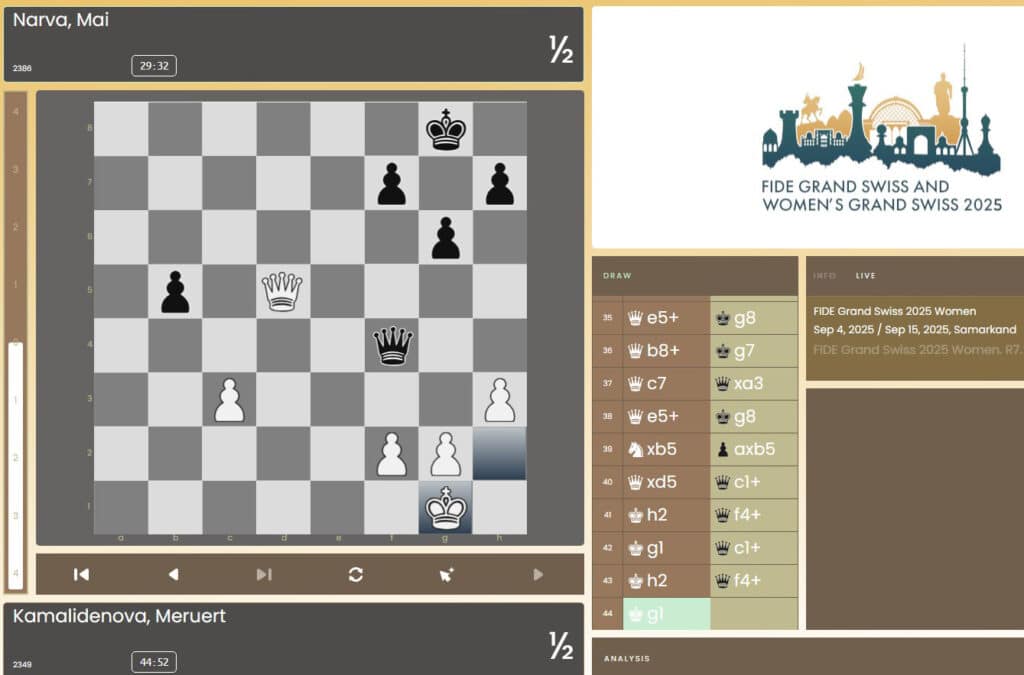 Меруерт Камалиденова (2349) белыми в редкой позиции с двумя ферзями заключила мир с эстонкой Май Нарвой (2386). Набрав 3,5 очка, наш международный мастер идет 30-й.