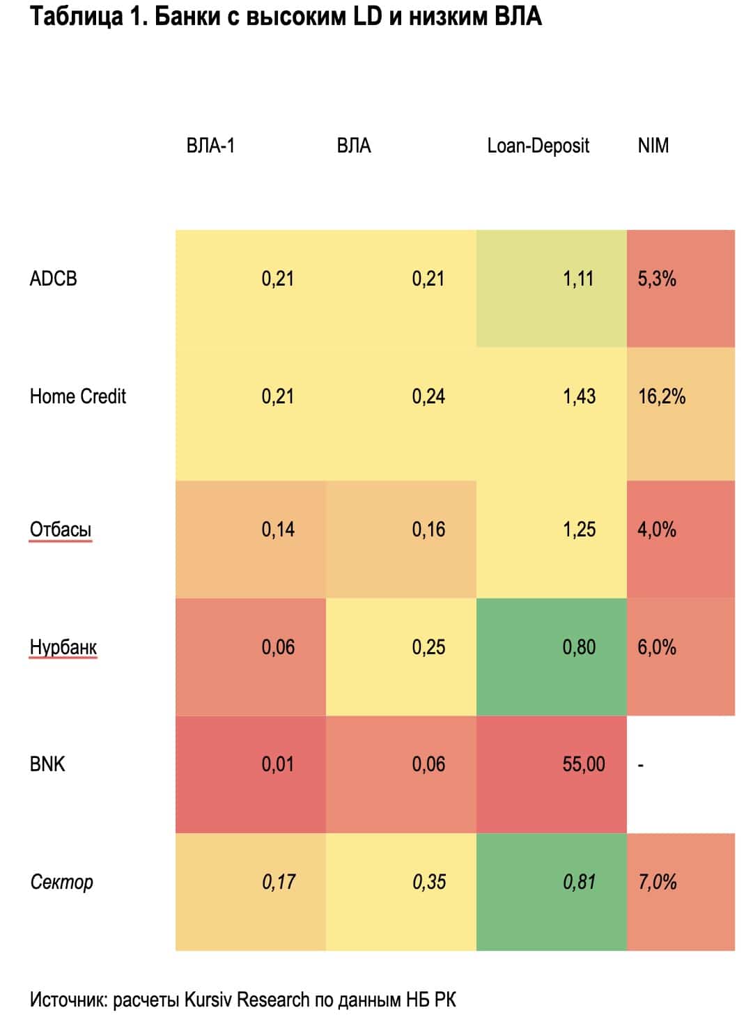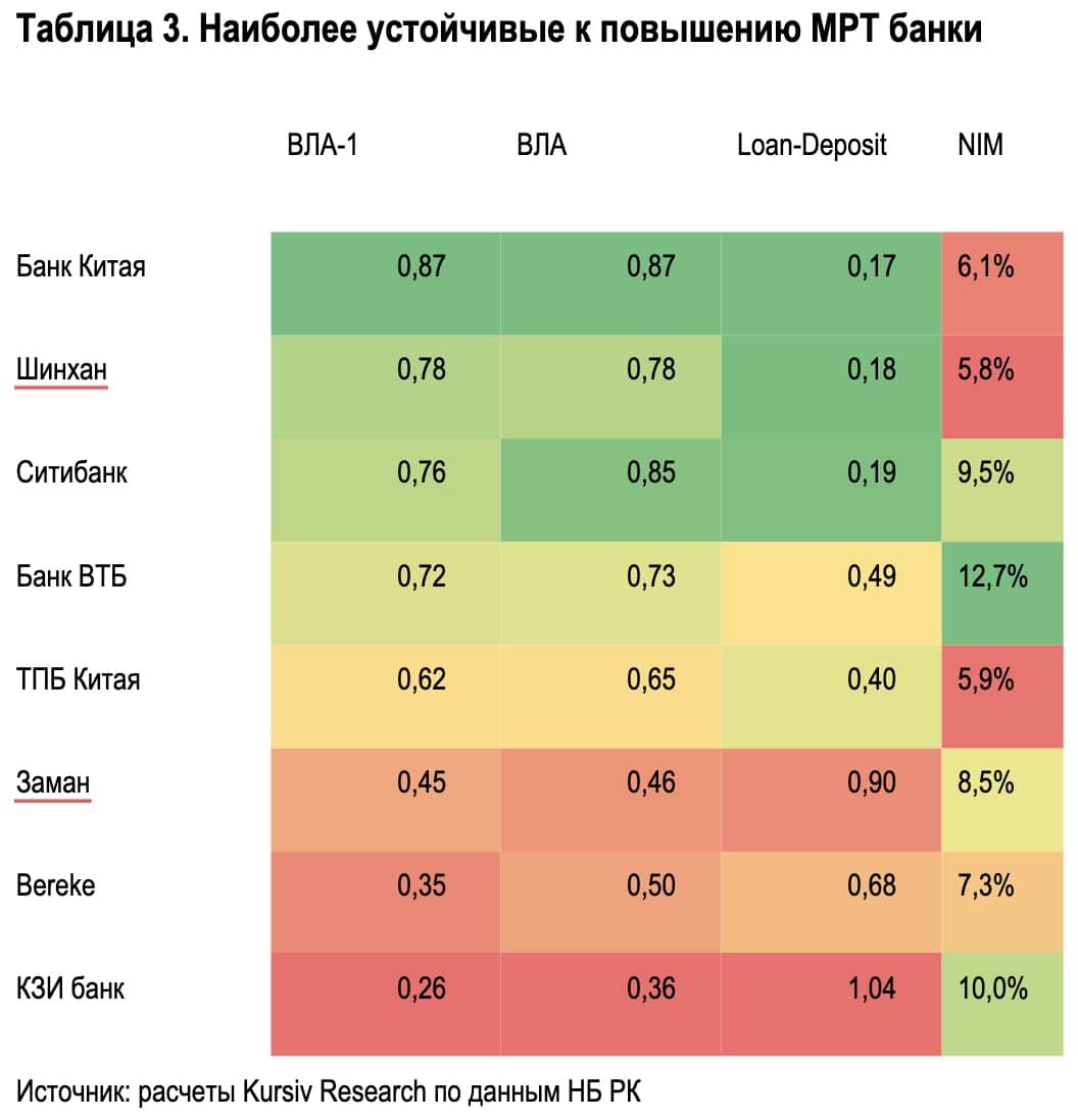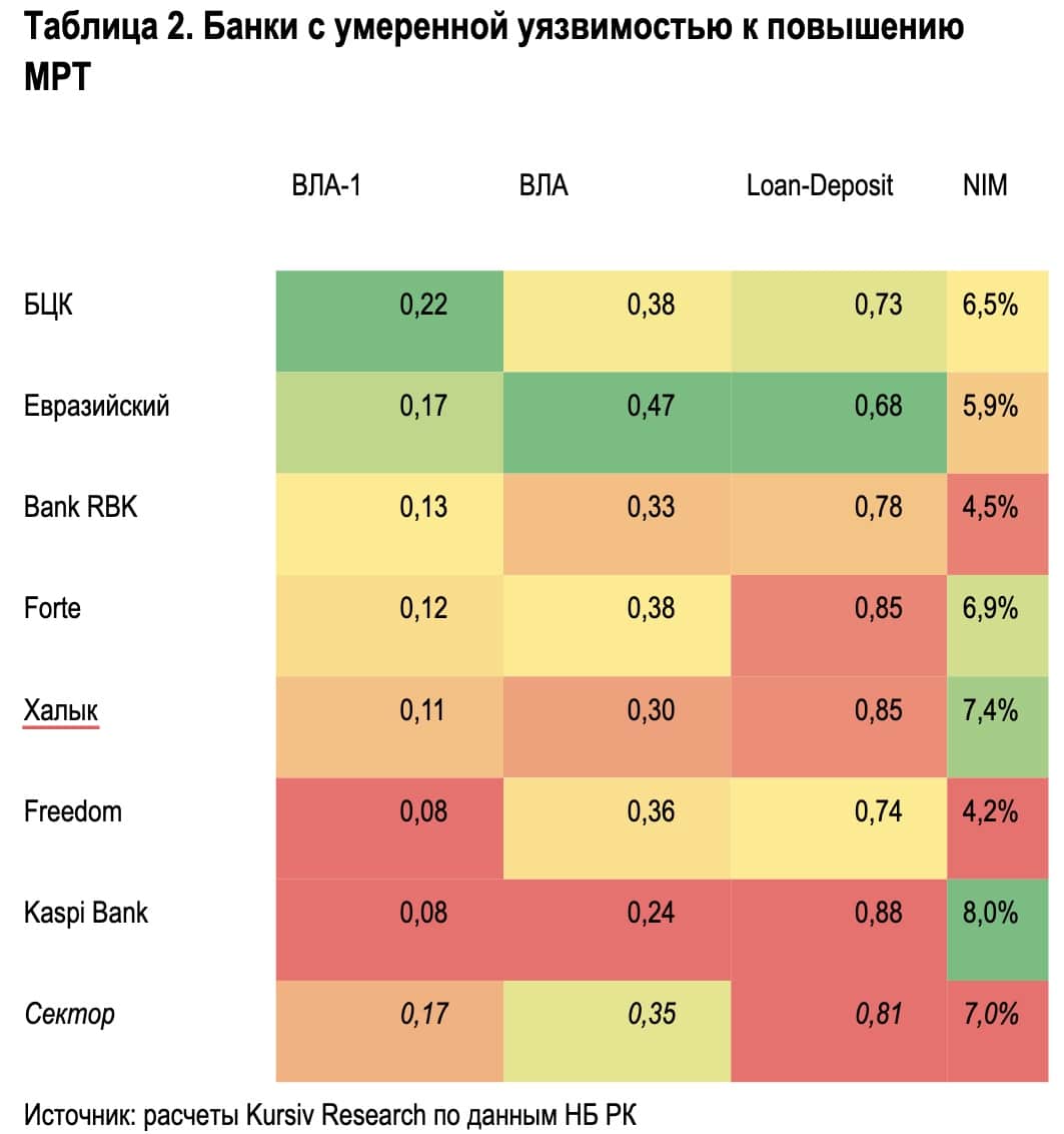 К группе банков, наиболее чувствительных к изменению МРТ, можно отнести пять игроков. У них высокий коэффициент Loan-to-Deposit и низкий объем высоколиквидных активов, что повышает риски ликвидности. С учетом такого подхода, в этой группе обращают на себя внимания Home Credit, Нурбанк и исламский ADCB.