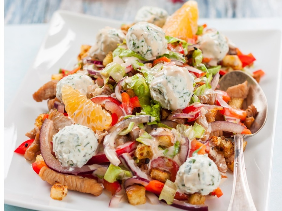 Полейте салат заправкой, выложите сверху сырные шарики. Салат готов к подаче.