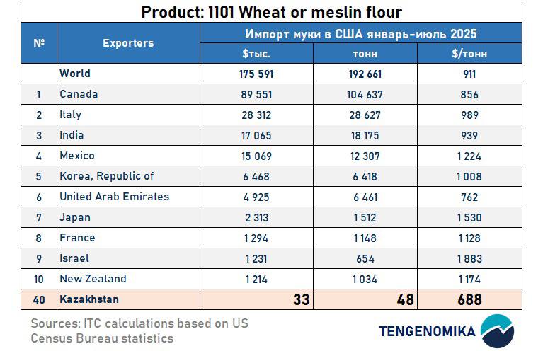За семь месяцев 2025 года Штаты импортировали 192,6 тыс. тонн муки за $175,5 млн. Основные поставщики – Канада (55%), Италия (13%), Индия (10%) и Мексика (8%).