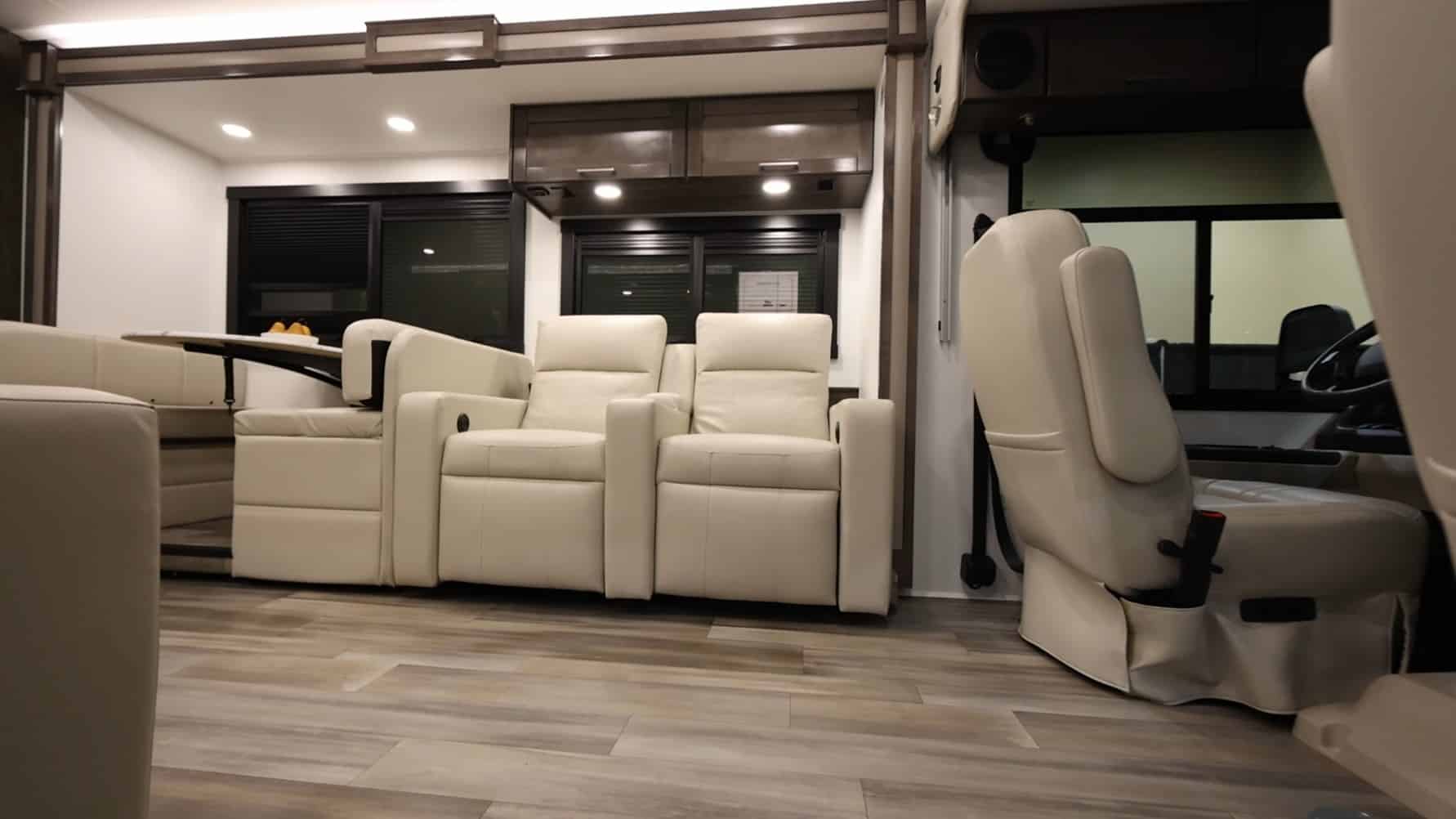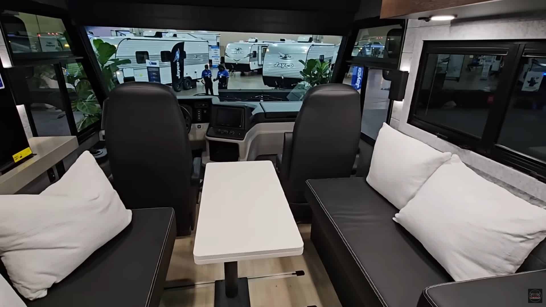 Интерьер автодома выполнен в современном стиле и предлагает полный набор удобств. На кухне — индукционная и газовая панели, а также встроенная техника: микроволновка, холодильник и морозильная камера. В гостиной разместили кожаные сиденья с портами для зарядки, 40-дюймовый смарт-телевизор и просторную кровать формата queen-size. Есть и просторная душевая кабина.