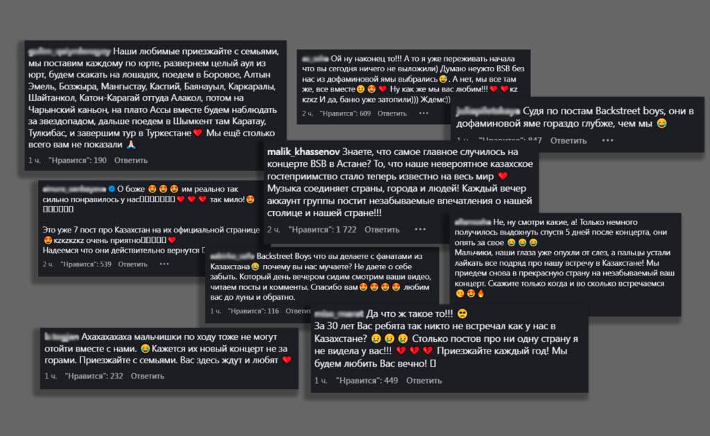 «Backstreet Boys, что вы делаете с фанатами из Казахстана? Вы не даете о себе забыть. Каждый вечер мы снова пересматриваем ваши видео и посты. Спасибо вам, мы любим вас до луны и обратно», — пишут поклонники.