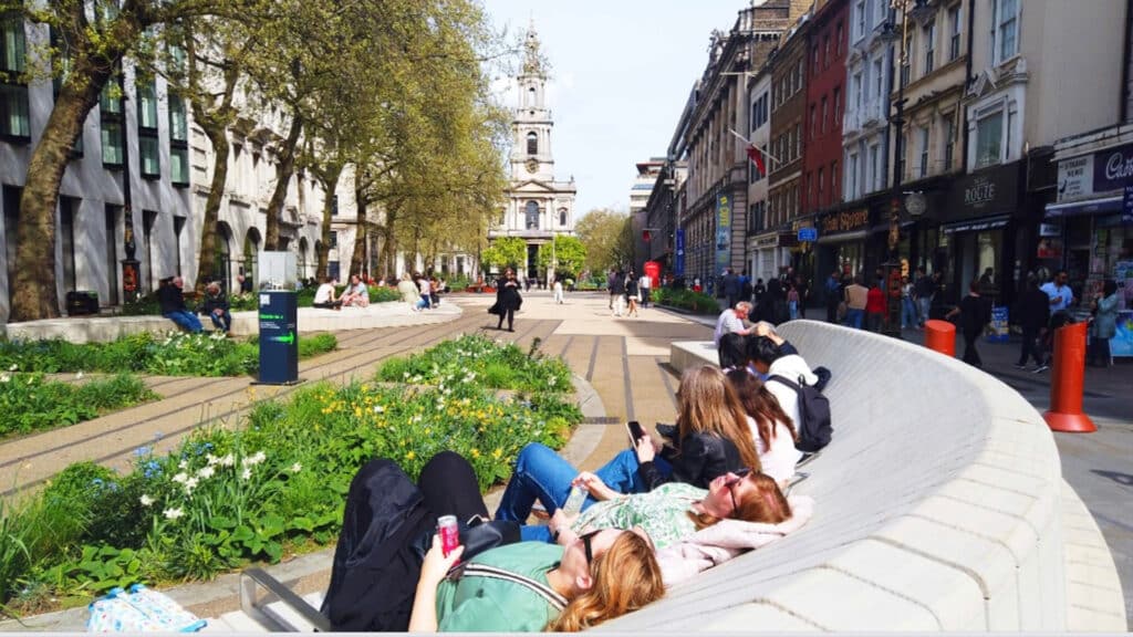 Концепции «Wellness city» и «Healthy Streets» — это не только про деревья и транспорт. Архитекторы знают, что городская среда влияет на физическое и психологическое здоровье человека. Удобные пешеходные маршруты, зелёные пространства, тишина и чистый воздух снижают стресс, стимулируют движение и общение, делают жизнь комфортнее. На форуме об этом говорили со-основатель New London Architecture Питер Мюррей и немецкий ландшафтный архитектор Райнер Шмидт. В работах британского бюро LDA особенно заметна эта тенденция: улицы без машин становятся удобными и здоровыми пространствами для людей.