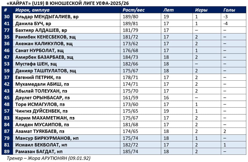 Между прочим, если бы не травмы Александра Заруцкого и Темирлана Анарбекова, ворота «Кайрата» (U19) защищал бы Шерхан Калмурза. Это его команда. А так ее состав выглядит полностью.