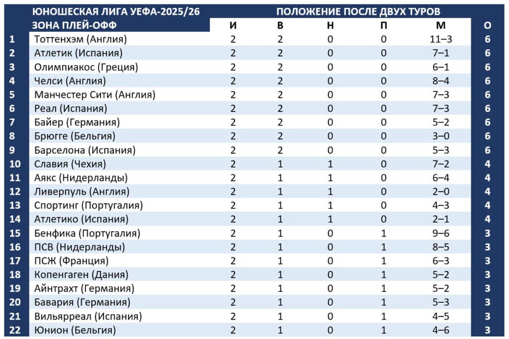 После двух туров турнирную таблицу Юношеской лиги УЕФА возглавляют восемь команд, набравших по шесть очков. В плей-офф выйдут 22 коллектива.