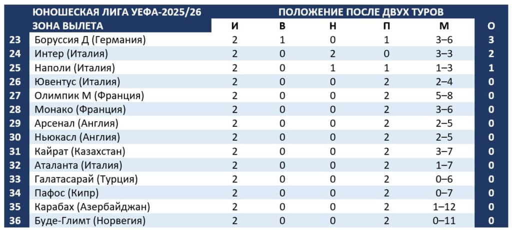 После двух туров Юношеской лиги УЕФА «Кайрат» (U19) занимает 31-е место из 36-и. В оставшихся четырех играх алматинским парням непременно нужно набирать очки, чтобы выйти в плей-офф.