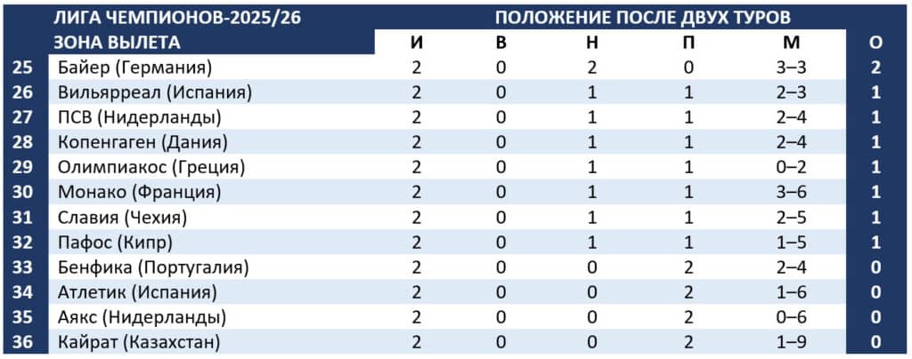 Команды, занявшие 25–36 места, выбывают из турнира. Обратите внимание в какой звездной компании находится на дне таблицы «Кайрат».
