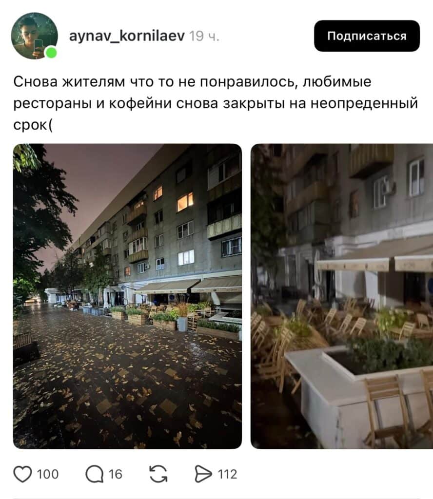 Вчера в соцсетях горожане обратили внимание на то, что рестораны по адресу Панфилова, 114 — прямо у станции метро «Алмалы» — закрыты: двери заперты, свет внутри не горит. Для улицы, где обычно кипит жизнь и гуляют не только алматинцы, но и тысячи туристов, такая картина выглядит непривычно и даже мрачно.