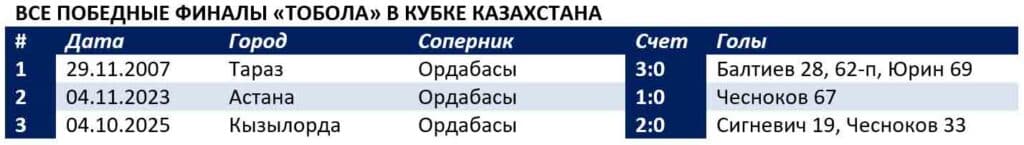 Любопытно, что во всех победных финалах «Тоболу» оппонировал «Ордабасы». И все они состоялись в разных городах. Костанайский клуб делит вторую строку с «Женисом» в рейтинге самых успешных кубковых команд страны.