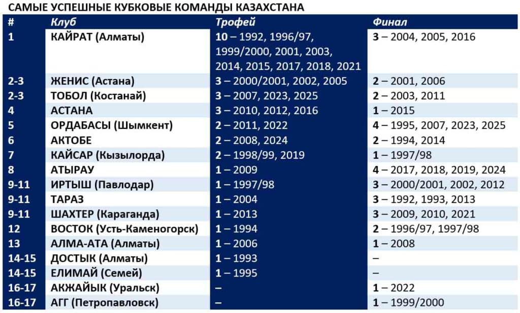 Любопытно, что во всех победных финалах «Тоболу» оппонировал «Ордабасы». И все они состоялись в разных городах. Костанайский клуб делит вторую строку с «Женисом» в рейтинге самых успешных кубковых команд страны.