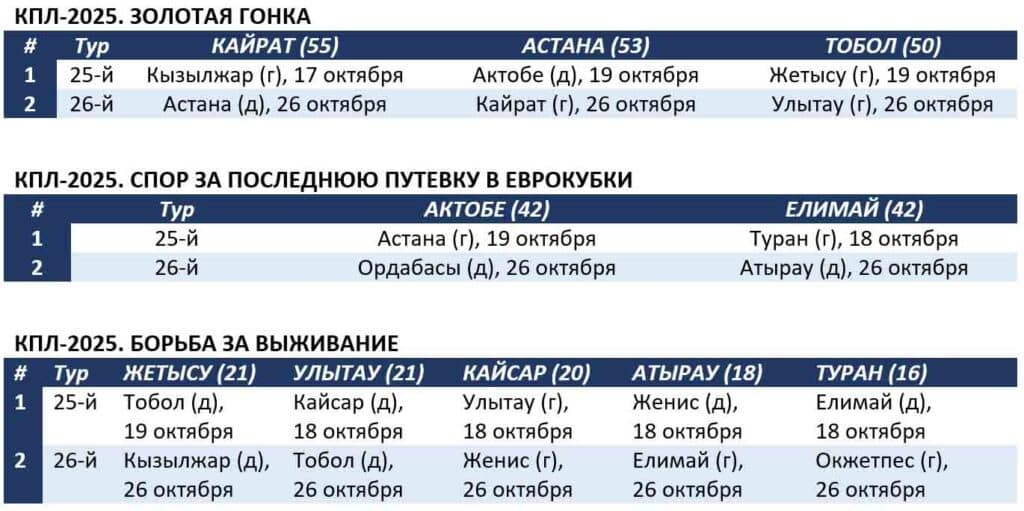 После вчерашней победы костанайцев в Кубке страны «Актобе» и «Елимай» поборются за последнюю вакансию в еврокубках. В нижней части таблицы пять клубов определят одного лишнего в борьбе за выживание в элите.