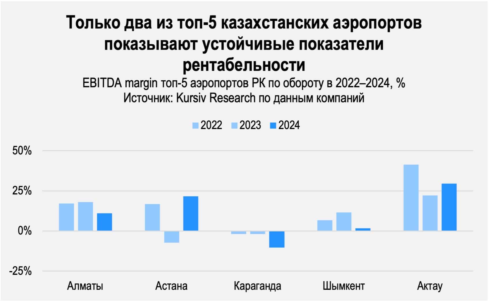 Kursiv Research изучил отчетность публичных компаний – отечественных аэропортов по итогам 2024 года – и подготовил ренкинг из топ-10 предприятий по объему реализации (размеру выручки). По нашим оценкам даже с учетом непубличных предприятий, ведущих хозяйственную деятельность на базе воздушных гаваней Уральска и Петропавловска, собранный нами состав участников представляет не менее 95% всей выручки казахстанских аэропортов. Сводную картину по этим предприятием справедливо считать срезом объективной ситуации по отрасли в целом.