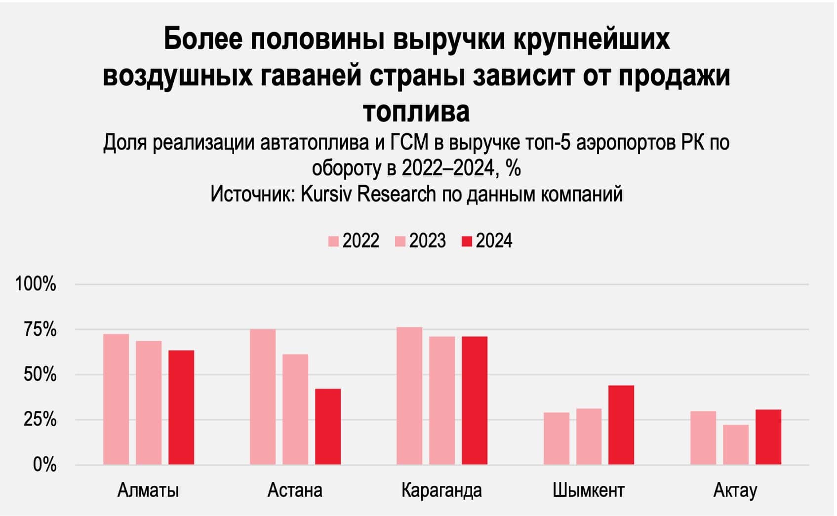В последние годы основу выручки аэропортов составляет продажа топлива, которая дает от 25 до 75% выручки воздушных гаваней из топ-5. Причем, судя по всему, рентабельность достигается главным образом благодаря продаже авиатоплива иностранным авиаперевозчикам, поскольку под госрегулирование попадает и обеспечение топливом воздушных судов казахстанских перевозчиков.