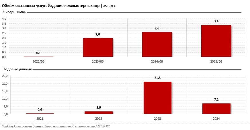В Казахстане продолжает расти бизнес, связанный с выпуском и продвижением видеоигр. По данным Бюро нацстатистики, объем услуг по изданию игр за первые шесть месяцев 2025 года достиг 3,4 млрд тенге — на 28% больше, чем годом ранее.