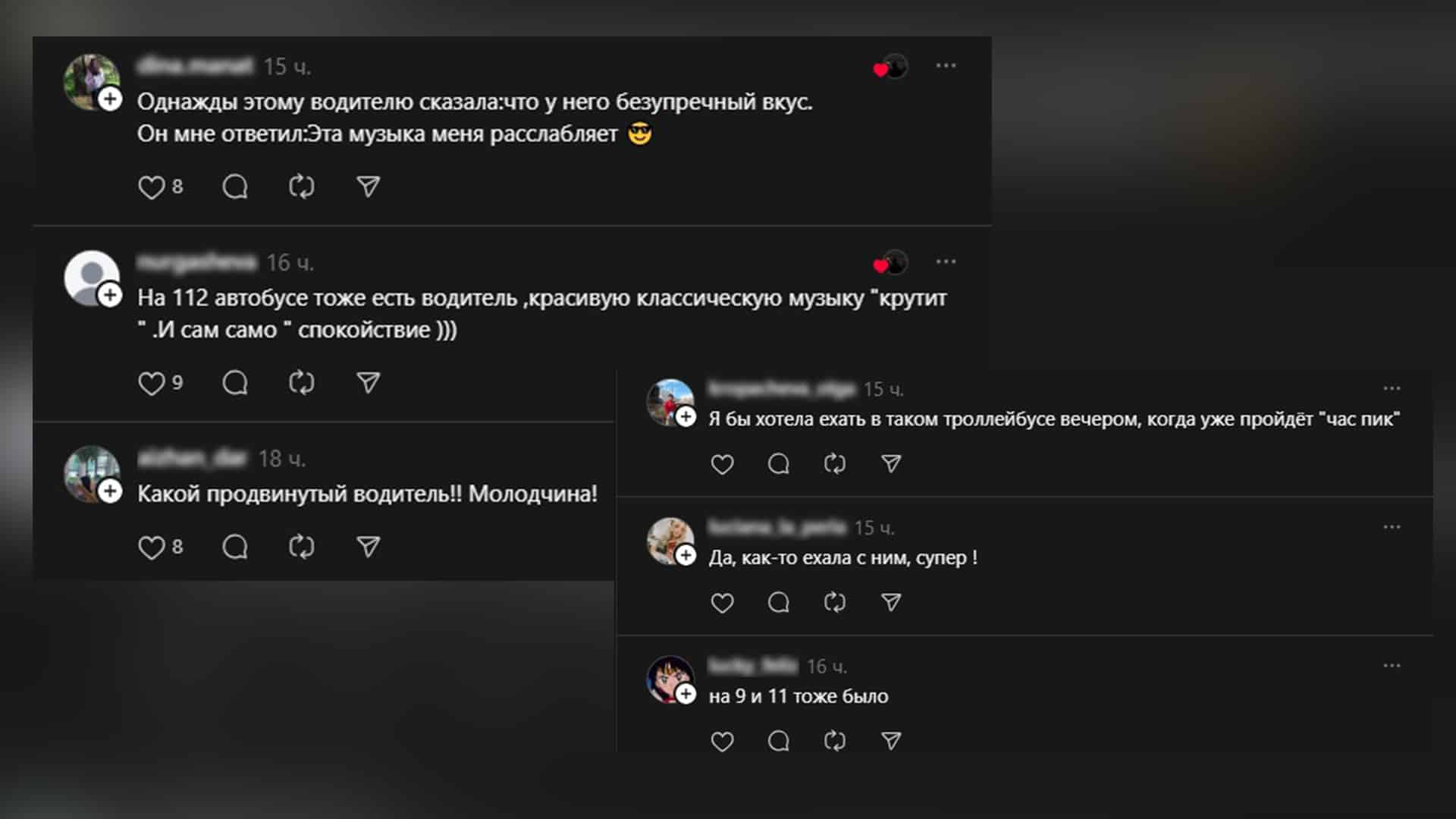 Комментаторы сразу подхватили тему. Кто-то поблагодарил водителя «за атмосферу». А другие отметили, что в Алматы водители с похожим музыкальным вкусом водят троллейбусы №9, 11 и автобус №112.
