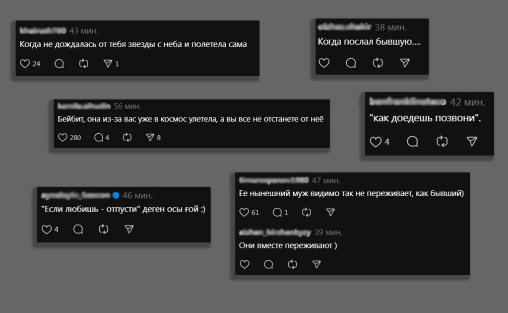 Казахстанский блогер и бизнесмен Бейбит Алибеков эмоционально отреагировал на исторический полет своей бывшей жены – предпринимательницы Данны Карагусовой, которая стала первой женщиной из Казахстана, побывавшей в космосе. В своем посте в Threads Алибеков написал: «Капец, я реально переживал за маму моих детей», добавив видео запуска ракеты. Сейчас Алибеков и Карагусова в разводе, у них трое общих детей.