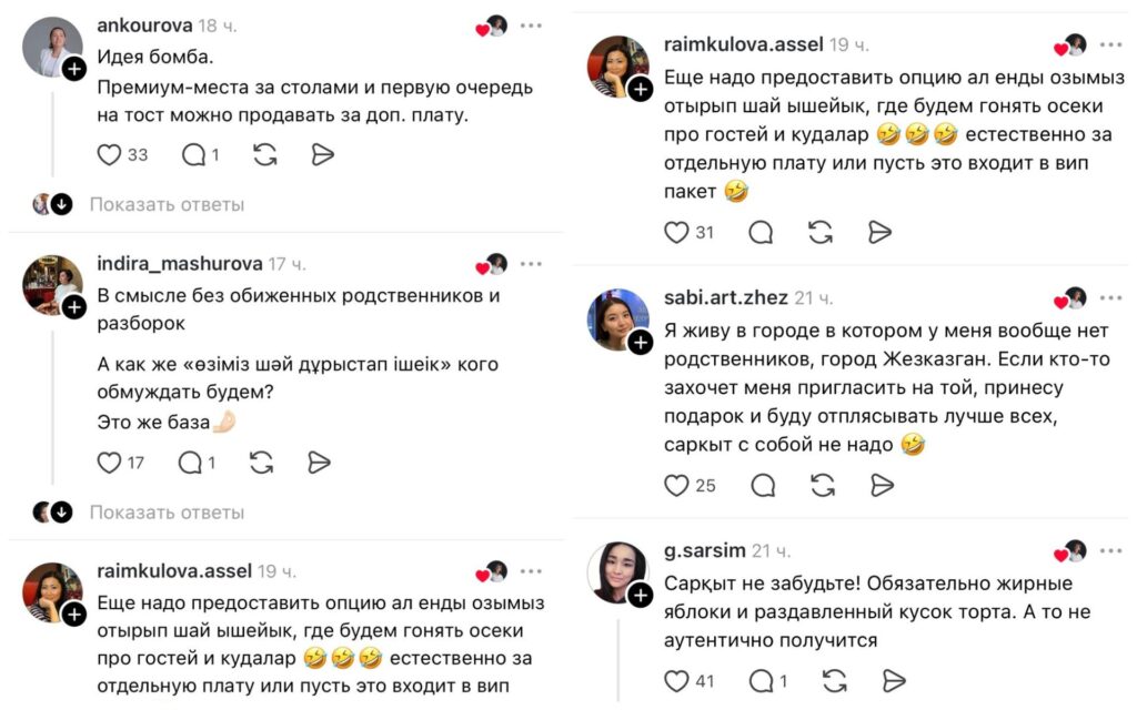 «Как вам такая идея для бизнеса? Сделать симуляцию реального казахского тоя для городских трудоголиков и иностранных туристов. Приходишь в ресторан, платишь за вход, ешь, участвуешь в конкурсах, танцуешь под «Балқия», говоришь тост, получаешь тойбастар. Настоящий тойский дофамин, но без обиженных родственников и разборок».