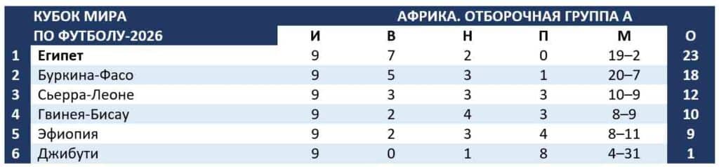 По регламенту квалификации Кубка мира-2026 в зоне КАФ путевки в финальный турнир получают победители девяти отборочных групп. Помимо египтян на ЧМ уже квалифицировались Марокко с Тунисом. До 15 октября определятся шесть других счастливчиков. Четыре лучшие команды, занявшие вторые места, в плей-офф определят представителя Африки для участия в межконтинентальных стыках.