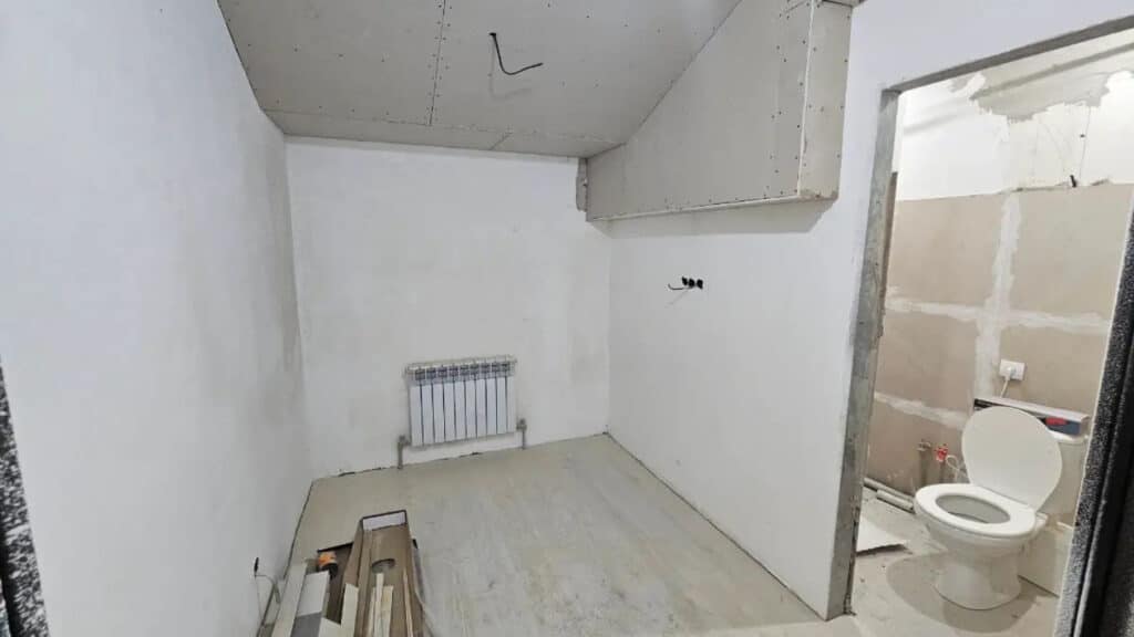 Продавец обещает новые двери, сантехнику, санузел в кафеле и центральное отопление, но на фото помещение выглядит скорее как черновой вариант.