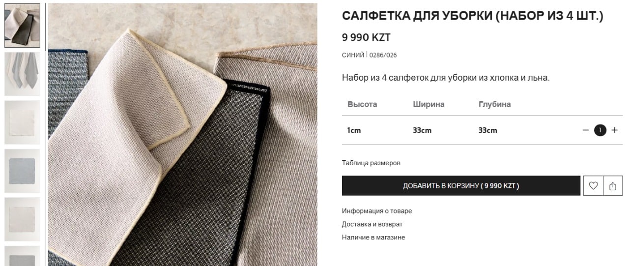 А завершает список «роскошных» находок набор кухонных тряпок. На сайте они указаны, как «салфетки для уборки». Набор из четырех штук обойдется в 9 990 тенге.