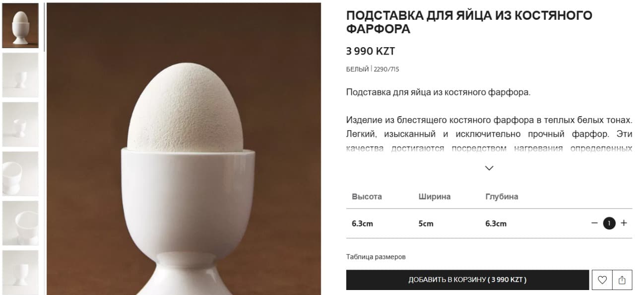 Не меньше удивила и простая подставка для яйца за 4 тыс. тенге. На сайте указано, что она изготовлена из блестящего костяного фарфора.