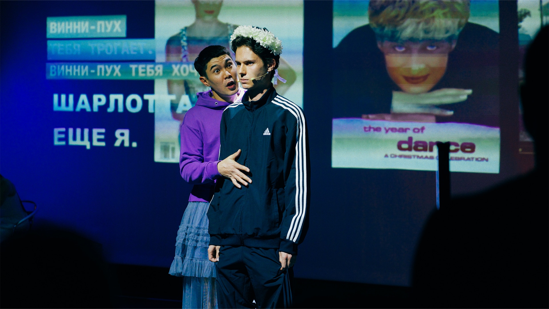 Экран играет не меньшую роль, чем актеры. Зрители наблюдают за настоящим потоком сознания в пикселях: футажи из Left 4 Dead, всплывающие уведомления из Grindr, переписки, мемы, видео из TikTok и — внезапно — берлинский Берхайн, воссозданный в Minecraft. Экран становится отражением внутреннего мира героя.