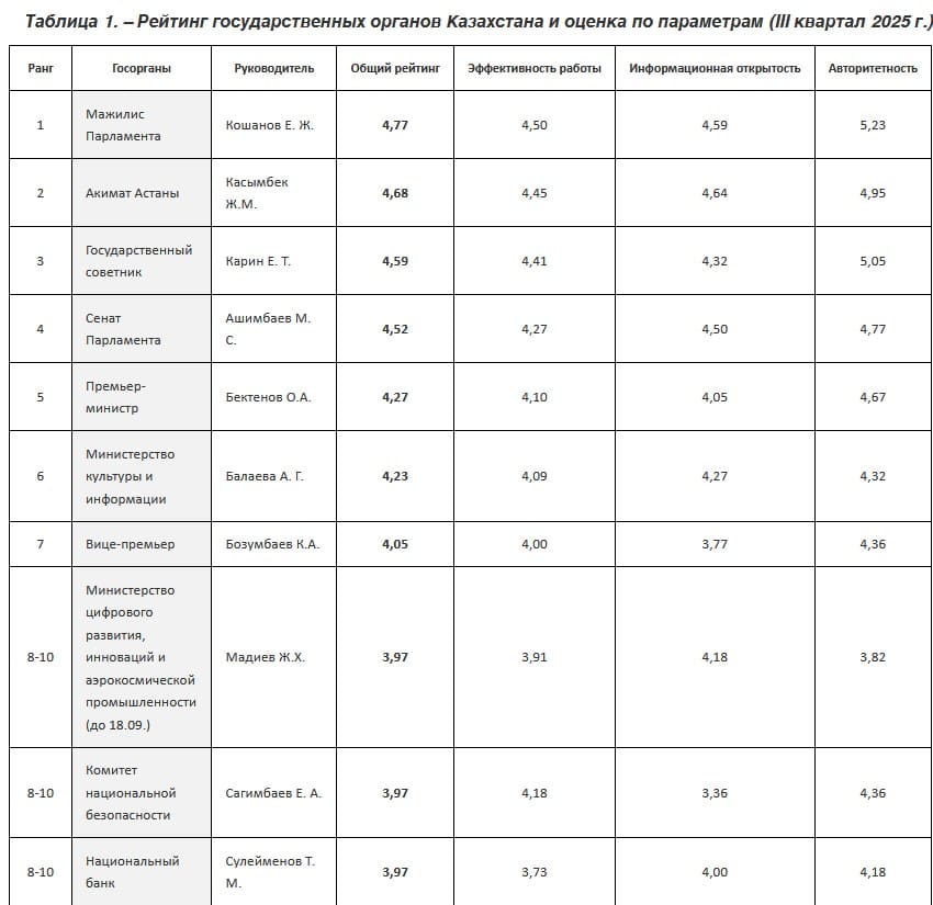 Рейтинг авторитетности возглавил спикер Ерлан Кошанов, удерживающий первое место. На втором месте – госсоветник Ерлан Карин, поднявшийся с третьей позиции. А третье место занял аким столицы Женис Касымбек. Премьер-министр Олжас Бектенов опустился на пятую строчку, а экс-министр Мурат Нуртлеу резко потерял позиции, скатившись на 21-22-е места. Аутсайдерами остаются Ерлан Нысанбаев, Асет Иргалиев и Ерлан Сарсембаев.