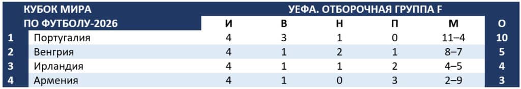 Венгрия, Ирландия и Армения продолжают гонку за путевку в стыковые матчи. 13 ноября армяне примут мадьяров в Ереване. В этот же день португальцы в случае победы в Ирландии могут обеспечить себе первое место в квартете F.