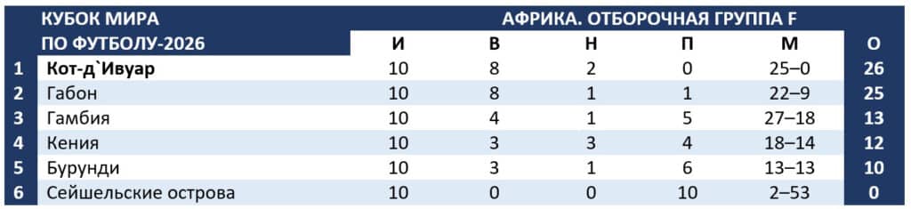 Лишь в последнем туре квалифицировался на ЧМ и Кот-д` Ивуар, всего на один балл опередивший Габон. Виктория над Кенией – 3:0 (Кесси 7, Диоманде 54, Диалло 84) стала для «Слонов» решающей. Команда с Берега слоновой кости (бывшее название Кот-д` Ивуара) тоже примет участие в финальном турнире Кубка мира четвертый раз. Из группы до сих пор ни разу не выходила.